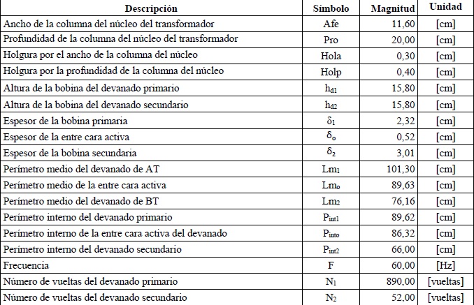 Se muestran los resultados del cálculo de la reactancia de dispersión de un transformador de distribución de dos devanados cuya reactancia de cortocircuito medida según [11] es 39,618 Ω. Los parámetros físicos del transformador, se muestra en la tabla 1.