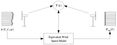 Adicionalmente, este modelo presenta la velocidad del viento equivalente (Veq.), representada como una secuencia mediciones de la velocidad del viento, realizadas en determinados momentos y ordenados cronológicamente (conocido como serie temporal), la cual es convenientemente empleada como entrada a un modelo aerodinámico, simulando además, el efecto de la turbulencia que experimenta una máquina eólica durante su funcionamiento. [14].