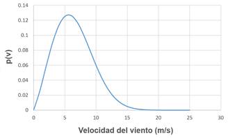 La probabilidad de ocurrencia de cierto valor de velocidad de viento vi p(v) a través de la expresión de la distribución de probabilidad de Weibull tiene la forma. Vea ecuación (17):