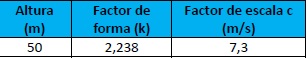 En la tabla 1, se muestran los valores de los factores de forma (k) y escala (c) promedios para una altura de 50m sobre el nivel del terreno. En la figura 4, se muestra las distribuciones de probabilidad de Weibull.
