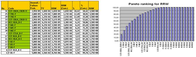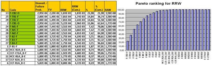 Figure 9, shows the most important MCSs. The first 11, representing 97,61% of the overall risk, describe accident scenarios in which the short circuit is followed by the failure of a circuit breaker, a DC power system or a component of the communication system (tone equipments, microwave transceivers or microwave channel). On the other hand, figure 10, shows the results of the importance analysis, indicating that circuit breakers (CB2, CB1), communication system equipments (TR1, TR2, M1, MC, M2,) and DC power systems (B2, B3, B4, B1) could contribute to a 97,91% risk reduction if these components would never fail. Decision making must be oriented to increase the reliability of these components, having the greatest values of Fussell-Vesely and Risk Reduction Worth (RRW).