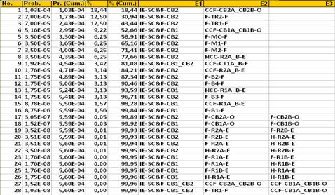 Note that the improvement measures are directed exclusively to the most important contributors identified as a result of the PSA importance analysis. The protective relays and current transformers would not allow a significant risk reduction and do not need to be considered. The results of the model reevaluation are shown in figures 12 - 15. Figure 12, indicates that 239 MCSs contribute to the overall risk of 5,60E-4/year. This result signifies that a not isolated short circuit leading to a damage D in the considered transmission line could be expected with a mean frequency of one event in 1786 years, representing a risk reduction of 88%.