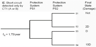 2. The Event Tree for the previously defined IE is shown in figure 2. The ET headings are the Protection Systems PS1 and PS2, corresponding to the circuit breakers CB1 and CB2, respectively. The accident sequences are S2 (PS1 success / PS2 failure / Damage: 2D), S3 (PS1 failure / PS2 success / Damage: D) and S4 (Both PS1 and PS2 failed / Damage: 10D). The risk is calculated performing the evaluation of the accident sequence FTs for S2, S3 and S4, resulting from the fault tree linking of the IE with the system FTs of the Protection Systems PS1 and PS2, connected by an AND gate. For accident sequences S2 and S3, a NOT Gate precedes the FT of the system in success state.