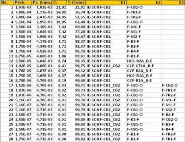 The CSolv+ solution for the Event Tree of figure 1, indicates that 209 accident scenarios (accident sequences MCSs) produce an overall risk of 4,72E-3/year, as shown in figure 8. This result signifies that a not isolated short circuit leading to a damage D in the considered transmission line could be expected with a mean frequency of one event in 212 years. This value is apparently low, but it can not be forgotten that if the Electric Transmission System is composed of several transmission lines of this type, the risk of such an accident in one of them would be much greater.
