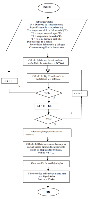 Las soluciones analíticas dadas en este estudio, son resultado de un proceso de simulación, cuya secuencia de cálculo se describe, en la figura 3, algoritmo de cálculo del procedimiento descrito, en que la expresión general de la ecuación de la conducción en régimen transitorio y el empleo del software WolframMathematica, son las herramientas esenciales, puesto que en este caso, el proceso de enfriamiento, se produce mediante agua helada, en diferentes bañeras, se requiere de un control muy meticuloso, para lograr los mínimos tiempos de enfriamiento con la exactitud deseada, en correspondencia con las temperaturas y las propiedades termo físicas del material, para así lograr consumos energéticos, acorde a las producciones que se realicen como expresión de un mejor desempeño [6-9].