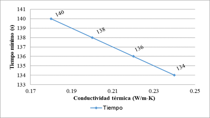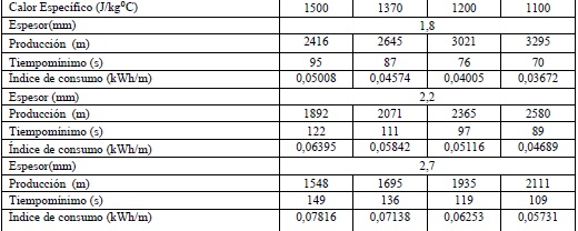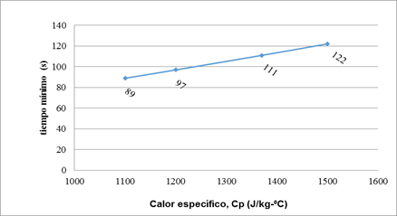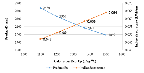 La tabla 3, muestra un resumen del comportamiento del calor específico actuando como variable y se mantienen contantes la densidad y la conductividad térmica. Puede verse como en la medida que disminuye su magnitud, aumenta la producción, decreciendo el tiempo y por tanto existe un mejoramiento en los índices de consumo energético, situación que puede verse también en las figuras 4 y 5.
