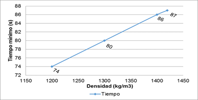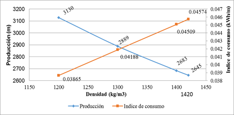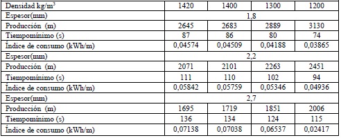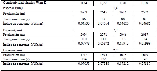 La tabla 4. mostrada acontinuación, representa un comportamiento de la variación de la densidad, manteniendo contante, la conductividad térmica y el calor especifico, el resultado es que, en la medida en que decrece su magnitud, aumenta la producción, disminuyendo el tiempo mìnimo y el indice de consumo, para cualquier espesor, siendo significativa la diferencia de los valores que representan los cambios. Esta propiedad es de las principales a tener en cuenta en el diseño de los flujos de las máquinas, puede observarse este planteamiento en las figuras 6 y 7.