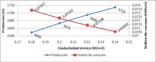 La tabla 5, muestra cómo se comportan los indicadores productivos e índices de consumo, con la variación de la conductividad térmica, manteniendo contantes, el calor específico y la densidad. Aquí sucede todo lo contrario, a los ejemplos anteriores, pues en la medida que decrece en magnitud, disminuye la producción, aumenta el tiempo y por consiguiente el índice de consumo, es apreciado también, en las figuras 8 y 9.