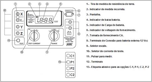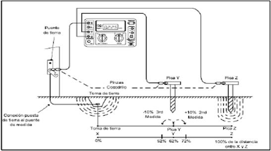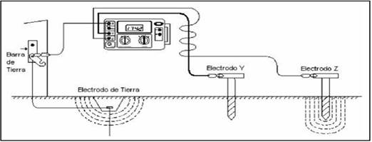 O instrumento de medida: Metro de Digital Terras AEMC Modelo 4500 gera uma corrente conhecida entre o eléctrodo externo de corrente (Z) e o eléctrodo de terra baixo teste (X), enquanto é medido o potencial de caída de tensão entre o eléctrodo auxiliar interno de potencial (Y) e o eléctrodo de terra (X); usando a lei de Ohm (V = IR), o medidor de terra, calcula automaticamente o valor total da resistência de posta a terra. Na figura 8, é indicado o diagrama de conexão para a comprobação da resistência de acordo com o método caída de potencial. [11-12]