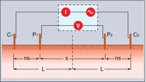 Tal como é mostrado na figura 7., os quatro eléctrodos ficam situados em um mesmo eixo; é injectada corrente à terra pelos eléctrodos de correntes externos e é medida a diferença de potencial entre os eléctrodos potenciais internos.