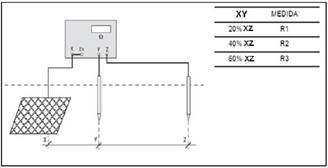 Para o desenvolvimento correto do método do pendente tomem-se leituras situando a pica Y às distâncias: 20%, 40% y 60% desde o eléctrodo X. Estas leituras são: R1, R2 e R3 respectivamente, figura 9.