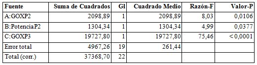 Las tablas de análisis de varianza son métodos propios de los diseños experimentales, permiten saber si realmente existe una relación de dependencia entre las variables objeto de estudio y permiten conocer la significancia estadística de los factores involucrados en cada índice de desempeño energético.