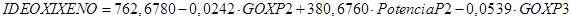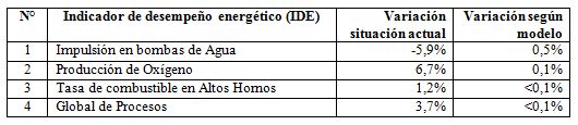 En las tablas de la 1 a la 4, se presentan los resultados del análisis de varianza para los indicadores de desempeño energético: Consumo Bombas de Agua (IDE BOMBAS), Compresión en Planta de Oxígeno (IDE OXIGENO), Tasa de Combustible en Altos Hornos (IDE COMBUSTIBLE) e Índice Global de Procesos (IDE GLOBAL). Además, en cada caso se presentan las ecuaciones de regresión e índices de regresión ajustado respectivos (r2 ajustado).