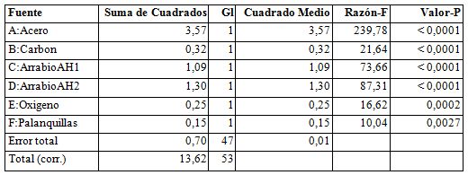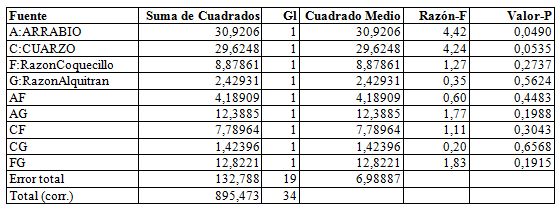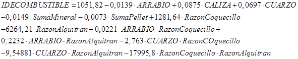 Para el caso del indicador Tasa de combustible en Altos Hornos (TASA COMBUSTIBLE), los factores relacionados con la producción de Arrabio, consumo de cuarzo, razón entre coquecillo y alquitrán son los factores que resultan ser estadísticamente significativos, y que los eventuales efectos de interacción entre los factores anteriores no presentaron una significancia estadística significativa.