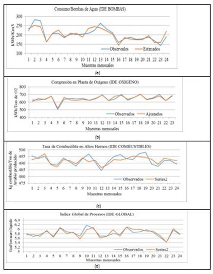 (4)En las figuras 1 (a, b, c y d), se presentan los resultados en forma comparativa de los cuatro Índices de Desempeño Energéticos cotejando los valores observados y estimados en un periodo de 24 meses. Similar método de comparación se utiliza en Lindberg (2015) donde también se utilizan indicadores de desempeño energético para mejorar la eficiencia de una caldera industrial 25.