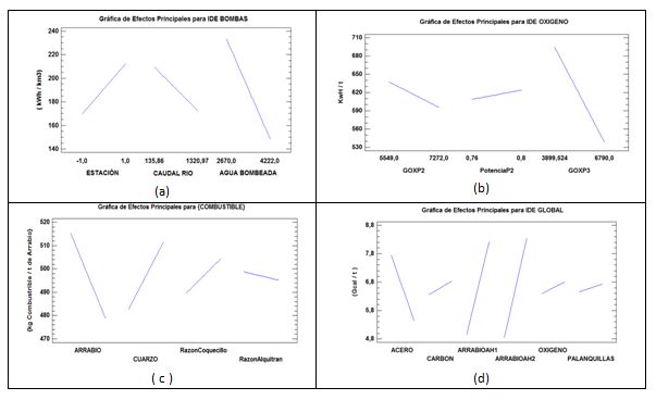 En la figura 2, se presentan los gráficos de los efectos principales asociados a cada uno de los cuatro indicadores de desempeño energético, de modo de examinar las diferencias entre las medias de nivel de cada factor (eje de abscisa) y su influencia sobre cada IDE. Cuando la línea es horizontal (paralela al eje de abscisa), entonces no hay efecto principal. En este caso, cada nivel del factor (alto o bajo) afecta la respuesta de la misma manera y la media de respuesta es la misma para todos los niveles de los factores. Por el contrario, cuando la línea no es horizontal, entonces hay un efecto principal. En esta situación, los diferentes niveles del factor afectan la respuesta de manera diferente. Mientras más inclinada sea la pendiente de la línea, mayor será la magnitud del efecto principal 26.