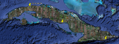 Three sites were selected: in the west, in the center and in the east, two of them with extreme latitudes and one in the middle latitude of Cuba.