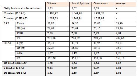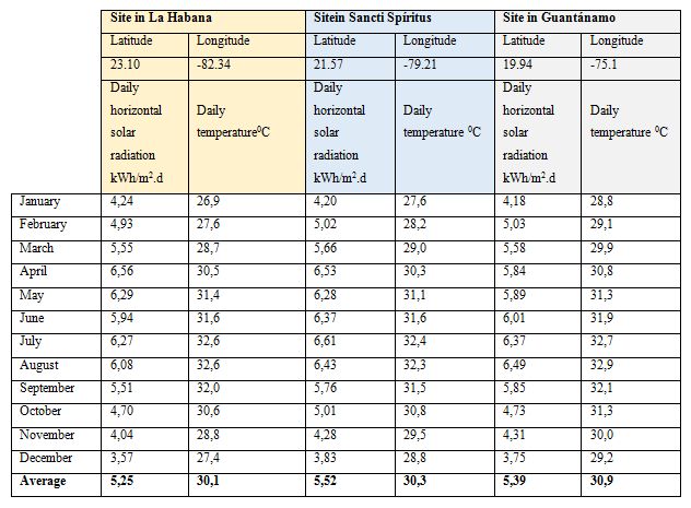 Two sites in extreme latitudes of Cuba and one in the middle latitude were selected (Fig 1). The monthly average data of horizontal global radiation and daily temperature, according to the latitude and longitude of each location in Cuba, were obtained from the Excel book "Interp" (table 1). This file is one of the results of the project "Determination of the distribution of solar radiation on the national territory from the information provided by the heliographic network", from the Centro de Física de la Atmósfera, InstitutodeMeteorología de Cuba.