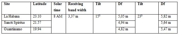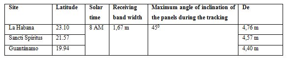 The ranges of the distance between the beginning of the previous row and the beginning of the next one, were calculated with the application "Calculation of tilt and hour" (original name in Spanish “Cálculo de ángulo y hora”), available at the Empresa de Fuentes Renovables de Energía, and developed by the authors of this text (table 3).