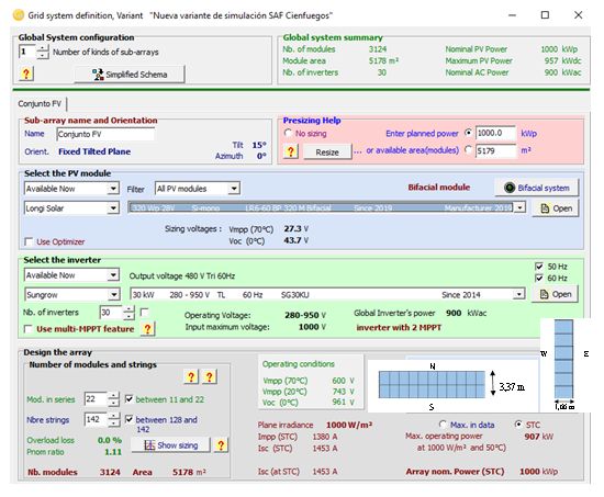 PVsyst V6.8.1 was also used. One LR6-60 BP 320 M Bifacial module from Longi Solar was used in "portrait" mode (Fig.2). The width of the receiving band is 1.66 m. There are no shadows from nearby objects, and no minor light obstruction losses on the back of the panel due to the mounting structures. The horizon profile will be PVsyst's own.Simulations of the three sites was carried out with a 1 000 kWp farm with 30 inverters (Fig. 2).