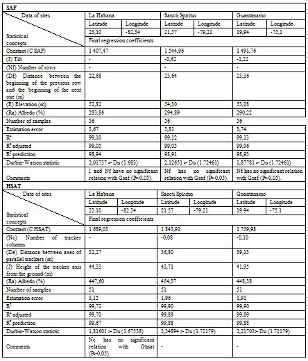 For Cuba, this issue is relatively new. Almost all papers reviewed mention or sort out some factors. One of them measures comprehensively the variations of energy due to influential factors, using the variance as a criterion. As explained before, it has some limitations. The last one developed an empirical model to estimate the bifacial gain taking into account the albedo, the elevation and the tilt angle. This approach is much closer to the method used by the authors of the present paper, who have tried to quantify the marginal influence of the most important factors explaining the energy gains of bifacial modules in the Cuban latitude range, both for SAF and HSAT, using a multiple linear regression model.