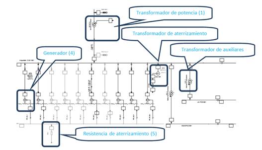 En una de las barras comunes están conectados además de los generadores, dos transformadores para alimentar las cargas auxiliares 3 y un transformador de aterrizamiento2, 5, 7. Los neutros de los generadores están conectados a una barra común de aterrizamiento la cual está aterrizada mediante una resistencia a tierra 5.