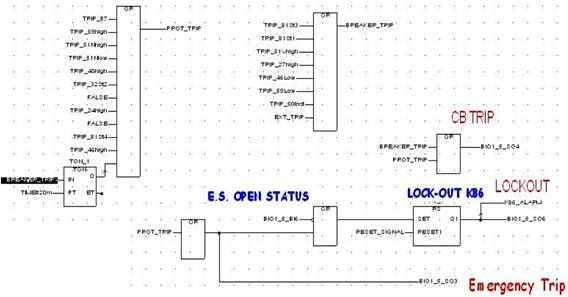 Luego de un cambio en la lógica interna para las señales de salida de los relés REM 543 como se muestra en la figura 4. Los generadores no solo disparan directamente al motor cuando realizan black-out (PROT_TRIP) a través del PLC sino que actúan sobre el Master Control Relay (MCR) localizado en el panel de control local (LCP). El MCR tiene un contacto directo solenoide que detiene el gobernador, por lo tanto, el disparo no debe ir al PLC para que luego envié una señal de salida para mandar a parar al motor, pues ya la señal va directo.Es como si el operador hiciera un disparo por emergencia accionando el botón rojo. Pero además, pasa por el PCL para mejorar aún más la confiabilidad del black-out.