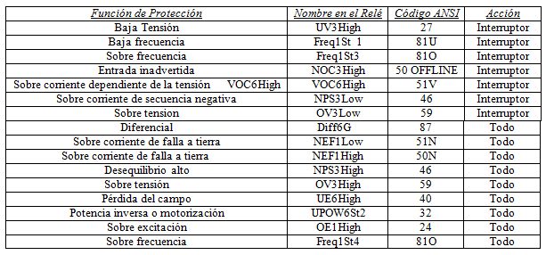 Algunas protecciones se dejaron para desconectar el interruptor y otras funciones de protecciones que de ser activadas desconectarían el interruptor de potencia y el motor de combustión interna (tabla 1).