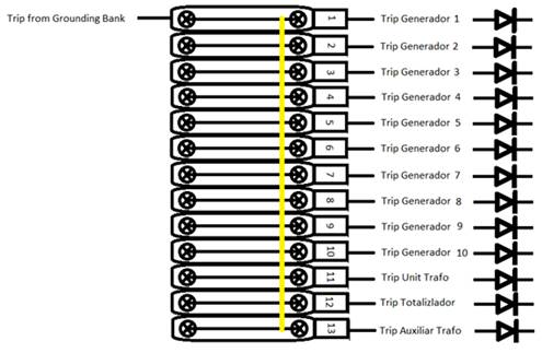 En el caso del Grounding Bank (Transformador de aterrizamiento) se modificó el esquema de disparo con el objetivo de cuando su relé REF 610 detecte falla, no dispare solo a dicho transformador sino que también enfrié o desconecte la barra de 13.8 kV. Se instaló una bornera adicional en los Grounding Bank en la que se encuentra las uniones de todas estas señales diseñadas para la configuración de la protección Black-Out de la barra (figura 5).