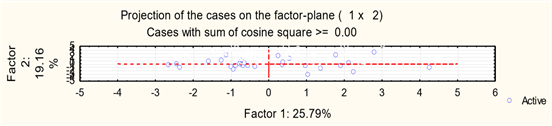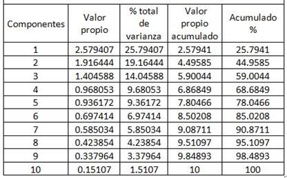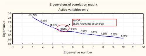 Estos valores propios representan la magnitud de la proyección hacia la máxima variabilidad de la muestra de referencia, es decir, el componente 1 va a poseer el mayor valor propio siendo este el que más información brinda en cuanto a variabilidad, mostrando en este caso un 25.7 % de la variabilidad total del modelo estudiado. El componente número 2 recoge un 19.16 % de la variabilidad total restante, el componente 3 recoge un 14.04 %, el cuarto componente recoge un 9.68 %, y así cada componente va recogiendo un porciento de la variabilidad total. Por lo tanto, queda evidenciado que los primeros componentes son los más importantes debido a que son los que mayor contribución a la varianza total reportan. Por consiguiente, ya los últimos componentes dejan de tener significados en el estudio y no se denominan principales. Para determinar los componentes principales se utiliza el criterio del gráfico de sedimentación de los mismos, a su vez, suele ser utilizado como contraste gráfico para conocer el número de componentes a retener. Según este criterio se retienen todos los componentes que están situados previamente en la zona de sedimentación, entendiendo por esta, la parte del gráfico en la que los componentes empiezan a no presentar pendientes fuertes, y como se muestra en la figura 1, para los datos obtenidos se pueden seleccionar hasta 4 componentes, como principales. Se observa que el punto que coincide con el cambio brusco de pendiente corresponde al número 3, el que reporta una varianza de 14.05 % y ya el 4 componente reporta una varianza de 9.68 %, es decir, va disminuyendo porcentualmente a la contribución de la variabilidad.
