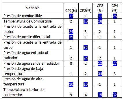 Mediante la reducción de dimensionalidad se obtienen componentes principales que explican la máxima variabilidad de las variables originales, por lo que las variables que mayor contribución tengan en los primeros componentes seleccionados como principales, serán las variables de mayor importancia para su control y vigilancia en el período posterior al análisis, pues estos podrían estar asociados a la variabilidad del comportamiento del motor 8, 12, para determinar los parámetros-síntomas que tendrán mayor variabilidad en el comportamiento mecánico-dinámico-funcional del miso. En la tabla 4, se muestra la contribución de las variables a los 4 componentes principales seleccionados. Los valores de contribución de las variables se muestran en porciento con el objetivo de ofrecer una mejor visualización de la información. Las variables que más influyen en el componente principal 1 son: la presión de aceite diferencial, presión de aceite a la entrada del motor, presión de combustible, presión de agua de alta temperatura, temperatura interior de contenedor y presión de agua salida del radiador, representando estas variables el 85.02 % de la variabilidad del componente, siendo este el que mayor información brinda en cuanto a variabilidad. Es preciso observar con mayor sistematicidad el comportamiento de las variables que contribuyen en gran medida a los componentes principales, porque son las que más aportan a la variabilidad del comportamiento del motor analizado.