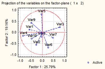 Por la cantidad de variables utilizadas en el análisis y por los resultados numéricos obtenidos, se decide marcar de color azul claro los valores de contribución de las variables que exceden al 10 % del aporte a cada componente, debido a que se considera que este porciento es suficiente para representar una alta variabilidad de los componentes principales. Si se toman todas las variables que proporcionen más de un 10 % al primer componente, la sumatoria de estos porcientos resultaría el 94 % de la variabilidad total del componente principal 1, por lo que en esta selección las variables que más varianza aportan representan más de la mitad del porciento de contribución al primer componente. Las variables de mayor rendimiento a la contribución de los componentes principales, son las más importantes, debido a que las mismas capturan la mayor variabilidad del proceso. Esta variabilidad está asociada con el comportamiento del motor, y se genera un resultado para posteriores análisis exploratorios de la condición de la máquina 11. La figura 2, muestra un círculo de correlación donde la interpretación resulta homóloga a la tabla 4 de contribución de las variables. En la misma se expone otra forma de visualizar las relaciones entre variables originales y componentes, en este caso se selecciona como muestra a presentar la proyección del componente principal 1 vs componente principal 2, debido a que en el plano solo se pueden visualizar 2 componentes 8, pues las proyecciones son ortogonales en el espacio. Los valores que se encuentran circulados de color negro muestran las variables que mayor contribución reportan al componente principal 1 por tanto, son las más significativas en este modelo de estudio. Al ser las cargas factoriales (Contribución de las variables) los coeficientes de correlación entre variables y componentes brindan una aproximación a la interpretación de los componentes.