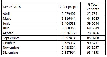 Para mostrar la obtención de los componentes principales se tomó en el mes de abril del año 2019, el motor 5 que se comportó de manera estable debido a que la variabilidad de los valores tomados, correspondió a los cambios aleatorios normales de operación 8, y no se mostró ninguna dificultad de origen mecánico, tecnológico o de operación. En la tabla 3, se ordenan los valores propios, de mayor a menor (enginevalue).