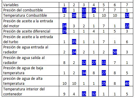 Se realizó la limpieza y procesamiento de las bases de datos, se obtuvo la influencia cuantitativa de los parámetros-síntomas en la variabilidad del comportamiento del motor a partir de la selección de los componentes principales y las variables analizadas, lo que demostró que las más significativas fueron: la presión de agua entrada al radiador, la presión de agua de alta temperatura y la presión de agua de baja temperatura, así como el parámetro presión de agua a la salida del radiador, las cuales recogieron la mayor variabilidad y se identificaron 4 componentes principales, los cuales acopian el mayor aporte en la variabilidad referida al comportamiento de los grupos electrógenos.