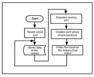 A C ++ routine was also developed to perform the reverse FFT. As the reverse FFT generation algorithm must be in an infinite loop in the same way as the capture algorithm, it was decided to use a second Arduino to perform the reverse FFT. Figure 4, shows the flowchart of the algorithm to perform the inverse FFT.