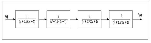 Due to these limitations, mainly the processing time, it was decided to keep the microcontroller for the analysis of signal distortions and to implement an active analog filter for the filtering of harmonic currents. The models used for the filter construction used were Butterworth polynomials. This type of filter was chosen due to its frequency being flat in the passband and approaching zero in the rejection band. The simplicity of the Butterworth filter construction is that it maintains the same format for low projects and also for higher orders, but with a very steep slope in the attenuation band while other types of filters, Bessel, Chebyshev, have different formats for higher orders therefore more complex in their design and construction. We opted to simulate the disturbances caused by these non-linear loads by evaluating the behavior of analog filters designed from amplifiers in different situations. For filter tests, Multisim software version 11 was used. Figure 5, shows a block diagram of the normalized transfer function of an 8-order filter. For the construction of even-order filters, it is enough to associate second-order filters in series.