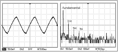 Figure 7, shows the waveform and harmonic spectra of a current of 1.4 Amps in a resistive load. The loads present in the purely resistive power circuits produce a current with the waveform shown in figure 1. A current signal like a slightly distorted sinusoidal signal was observed. Performing the FFT analysis, we observe the presence of harmonic distortion, indicated by the fundamental frequency and its harmonics (3H, third; 5H, fifth; 7H, seventh).