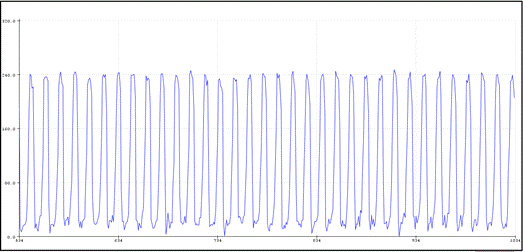 In order to perform the routine tests, a signal generator was used to produce sine, triangular and square waves of fundamental frequency 60Hz. Thus, these signals were captured, analyzed and processed in Arduino Due to verify the behavior of the generated spectra. After building the data acquisition system, the Fourier series graphics were obtained using the Arduino IDE interface to visualize the results of the developed algorithm. Figure 10, shows the waveform of the electrical current consumed by the power supply of a notebook. The number of sinoids corresponds to the size of the window chosen for the FFT. The Hamming window was used.