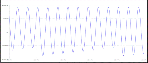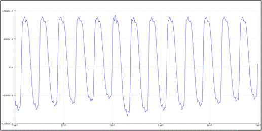 After the FFT execution, it was identified the existence of harmonics in the investigated loads. Also, from the stored vectors, which harmonics could be eliminated. For this purpose, the inverse FFT execution routine was applied to the calculated complex vector. Figures 13, 14 and 15, show the inverse Fourier transform performed by the microcontroller. Figure 13 shows the inverse transform for all FFT harmonic indices. Figure 14, shows the waveform of the inverse FFT applied over the normalized harmonics above order 2, frequencies below 80Hz were suppressed for the calculation. Finally, Figure 15 indicates the inverse transform of the fundamental frequency, values around 60Hz.