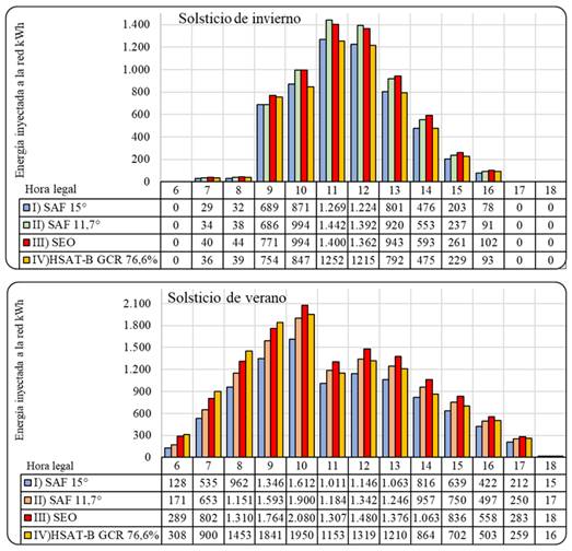 En el solsticio de verano la producción de energía es superior a la del SEO hasta las 10:00 AM. Es mayor que la generación del SAF 11,7° hasta las 11:00 AM y en horas tardías. La generación horaria es siempre superior a la del sistema tradicional (figura 11).