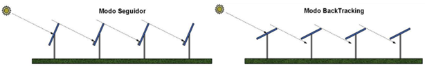 Con el propósito de aumentar el índice de ocupación del terreno, desde hace varios años se construyen parques fotovoltaicos son seguimiento solar retrasado. Esta técnica permite incrementar la generación minimizando el sombreado [3]. En vez de ejecutarse la rotación de los módulos en el ángulo que maximiza la incidencia de la radiación del sol, mediante un algoritmo, con el seguimiento retrasado se determinan los ángulos óptimos que evitan el sombreado mutuo (figura 2) [4].