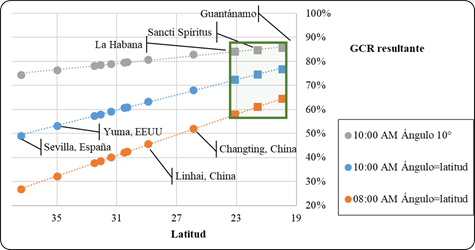 Bajo el enfoque de la escasez de la tierra y la maximización del beneficio económico en un espacio limitado [20, 21], con un GCR del 50% los sistemas HSAT y el HSAT-B requieren en Cuba una evaluación profunda. Para las latitudes de Cuba, con la aplicación de diferentes horas de diseño y ángulos de inclinación en los SAF, para evitar el sombreado mutuo entre paneles, los valores de GCR que se obtienen son altos con relación a aquellos para latitudes superiores (con el mismo ancho de banda receptora) y, por lo tanto, los SAF podría ser mejores competidores en la generación por unidad de superficie frente a los HSAT y los HSAT-B (figura 6).