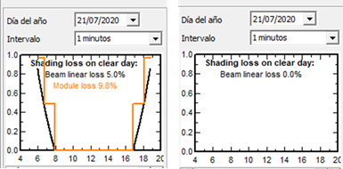 Con el seguimiento retrasado es ligeramente menor la radiación efectiva en los módulos, y con ello la energía nominal del conjunto a “condiciones de prueba estándares” (STC), pero como no existen pérdidas eléctricas según cadenas de módulos (por la acción de los diodos), finalmente aumenta la generación en 2,5% para la misma potencia (tabla 4 y figura 9).