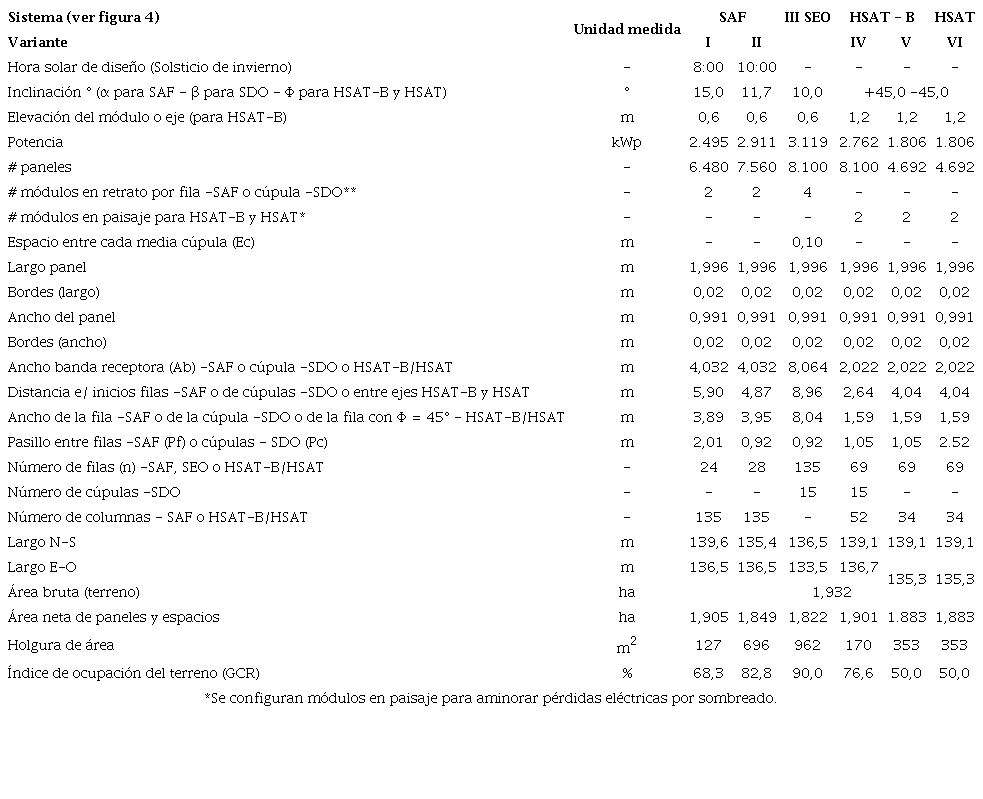 Ab:ancho de la banda receptoraDf:Distancia entre inicios de fila en SAFDe:Distancia entre inicios de eje en HSATDc:Distancia entre inicios de cúpulasEstá siendo común en el mundo, situación que debe ser más frecuente con el tiempo, que los parques fotovoltaicos se construyan en lugares menos óptimos desde el punto de vista de la radiación y con disponibilidad de tierra limitada o con restricciones [13]. Es de esperarse un aumento del costo de la tierra disponible en el futuro debido, entre otros factores, al desarrollo de la propia generación fotovoltaica. Por lo tanto, la optimización del espacio es una necesidad [14].