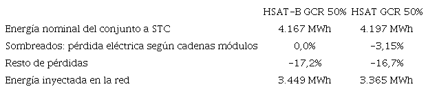 Los HSAT-B generan más por unidad de potencia (figura 10), pero con GCR 50% la energía producida es inferior a la del sistema tradicional, y no parece ser una alternativa bajo el enfoque de escasez de tierra.