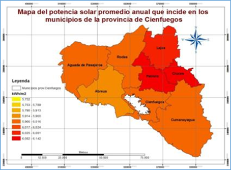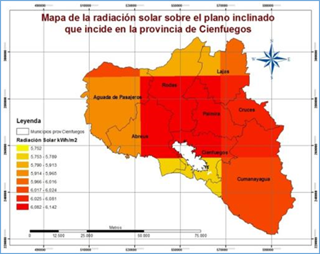 Se puede afirmar en teoría, que de poder aprovechar el total de la radiación solar incidente en la zona seleccionada en un día, se puede generar la energía eléctrica que a los ritmos actuales del consumo pudiera demandar el territorio durante unos 39 años; pero no es posible, ni se justifica desde el punto de vista económico, cubrir la totalidad del espacio de la provincia con paneles fotovoltaicos, es por lo que resulta de utilidad determinar las posibilidades y los límites actuales y perspectivos en esa dirección. Los valores de la radiación solar incidente en la provincia de Cienfuegos califican entre los más elevados del país, con un promedio diario anual de 6,004 kWh/m2d, un valor de la radiación máxima absoluta de 6,829 kWh/m2d, que suele producirse en el mes de abril y una mínima absoluta de tiene lugar generalmente en el mes de diciembre con valores de 5,150 kWh/m2d. Los meses del año donde la radiación solar se comporta por encima del promedio diario anual, corresponde de febrero a septiembre por debajo de este desde octubre a enero. En la figura 1, se puede apreciar el mapa del potencial solar promedio anual de la provincia de Cienfuegos.