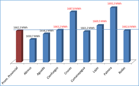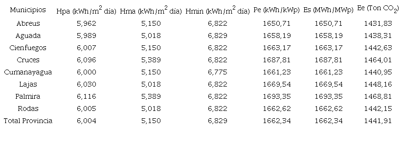 Como se puede apreciar en todos los municipios de la provincia no incide los mismos valores de radiación solar, pudiendo estimarse que el rendimiento energético de la tecnología no será la misma en todo el territorio. En la tabla 1 se ofrecen los datos estadísticos del potencial solar incidente, los cálculos del rendimiento energético y su impacto económico y medioambiental.