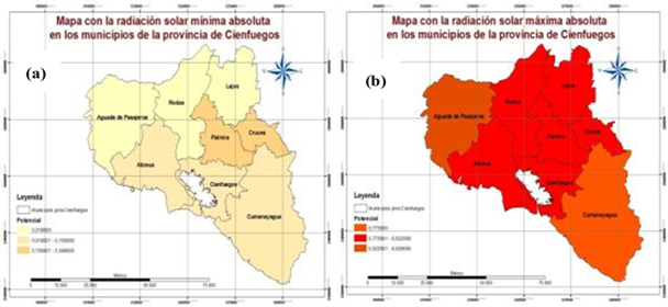 De esta manera las inversiones realizadas en los municipios de Palmira, Cruces, Lajas, Cienfuegos y Rodas por su orden deben asegurar niveles de rendimiento superiores al del resto de los municipios, con periodos de recuperación económica más breves. En la figura 4, se pueden apreciar los mapas de la radiación mínima y máxima absoluta por municipios, las CFV deben diseñarse para los meses de menor radiación para que no exista déficit de energía.