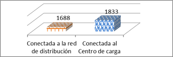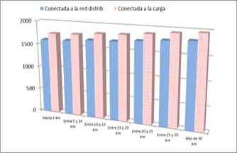 Los impactos energéticos, económicos y medioambientales estimados para un año, que puede representar la introducción de 1 MWp, en relación con los centros de demanda ubicados a una distancia entre 5 a 30 km distancias de los centros de generación del territorio conectado a la línea de distribución en el caso energético pueden estar en el orden 1765,4 MWh, en lo económico 111939 dólares y en lo ambiental se dejan de emitir 1557 ton CO2. En el caso de los conectados directamente a la carga se encuentran en el orden de 1954,9 MWh, en lo económico hay un ahorro de 121889 dólares y en lo ambiental se dejan de emitir 1696 ton CO2, notándose que los sistemas conectados directamente a la carga son las mejores opciones en los tres impactos analizados. Para la simulación se ha considerado el potencial solar promedio anual de la provincia de Cienfuegos, así como los porcientos de perdidas propuestos en el presente trabajo. En la figura 8, se puede apreciar el comportamiento gráfico del impacto energético que representa, la introducción de las CFV conectados a la red, en cuanto al ahorro estimado de electricidad generada con petróleo.