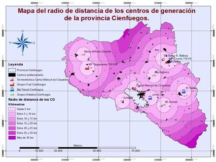 El análisis mostrado anteriormente demuestra, que cuanto más alejado se encuentre la generación el centro de demanda, la relación entre energía generada y el consumo real será mayor, pues las pérdidas asociadas a los procesos de distribución y transportación de la electricidad implican que, para consumir una unidad específica de electricidad, se tenga que generar el equivalente de esa propia unidad más las pérdidas. Si se considera importante que los primeros impactos de la introducción de los CFV conectados a la red, van a estar relacionados con la reducción del consumo de electricidad generada con petróleo, entonces resulta necesario modelar estos impactos para diferentes escenarios, vinculados al suministro de energía eléctrica a diferentes distancias de los centros de generación en la provincia y lo que puede representar en ello la introducción de las tecnologías fotovoltaicas. En la figura 7, se puede apreciar el mapa de la provincia, con la ubicación de los núcleos poblacionales a diferentes distancias de los centros de generación.